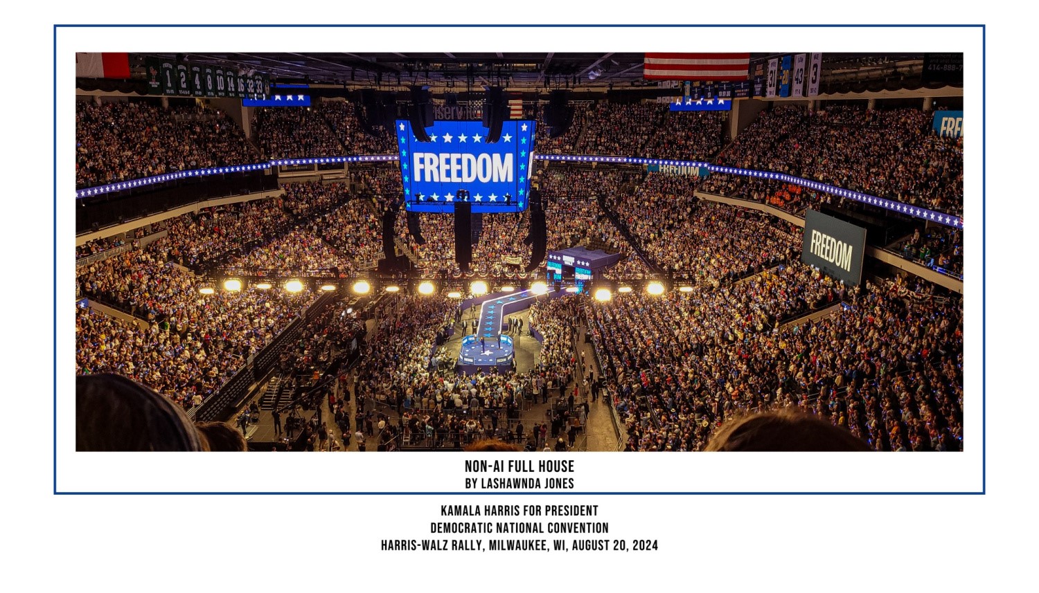 This wide shot is printed on 8×12 silk paper. It features three quarters of the stadium during the Democratic National Convention’s Milwaukee Rally at The Fiserv Forum on August 20, 2024. The word FREEDOM dominates the frame from the scoreboard in the center of the image above the historic candidates on the floor.