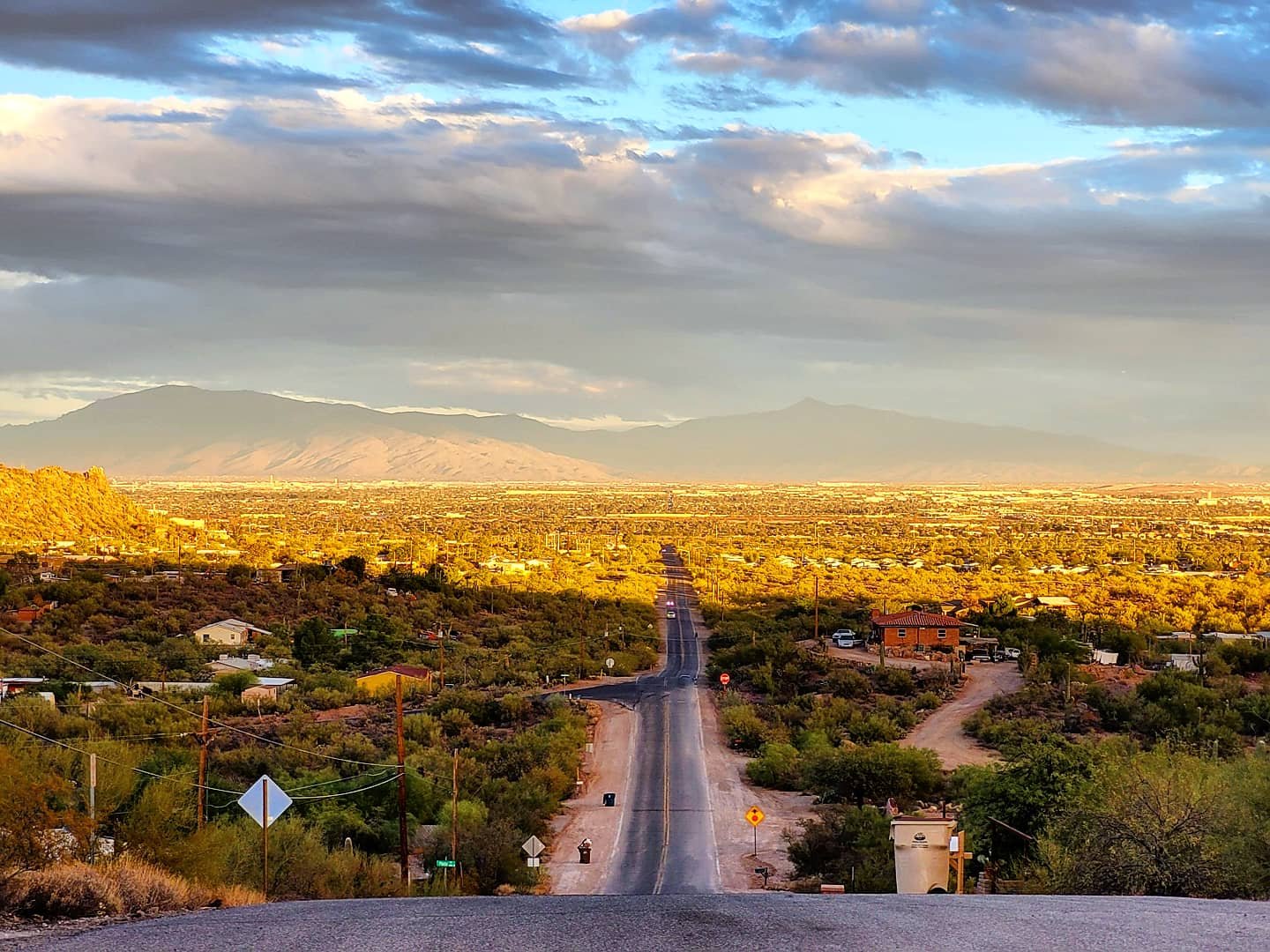 Looking across the sunlit valley at sunset